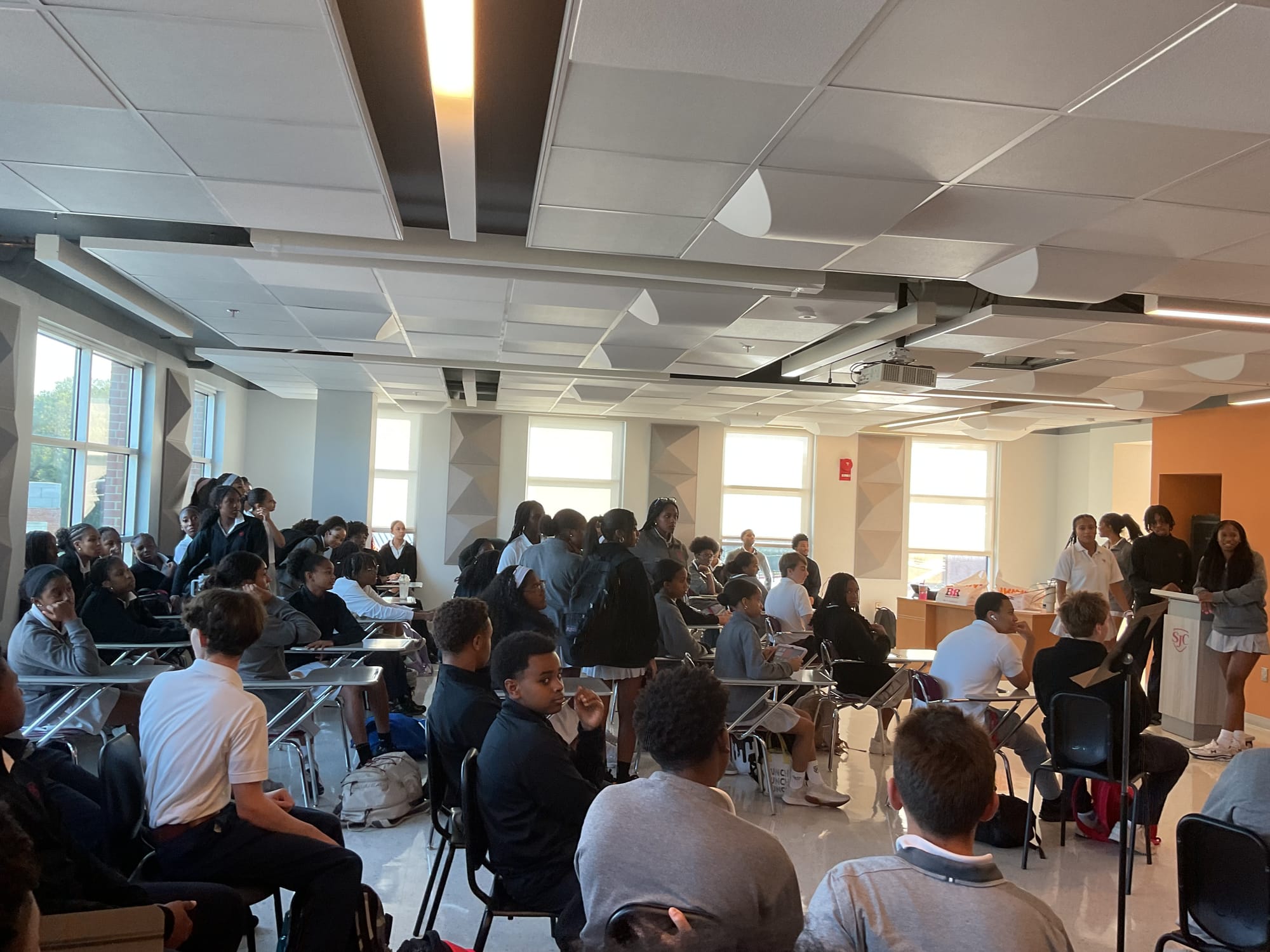 Last Friday during community time, the Black Student Union (BSU) held its first meeting of the year, drawing a large and enthusiastic turnout from students across all grade levels. Senior leaders Brooke Lancaster, R.J. Bernard, Osai Bintie, Addison Kafele, Ari Slade, and Giselle Grant introduced themselves, shared BSU’s mission statement and goals for the year, and led members in a fun singing game.